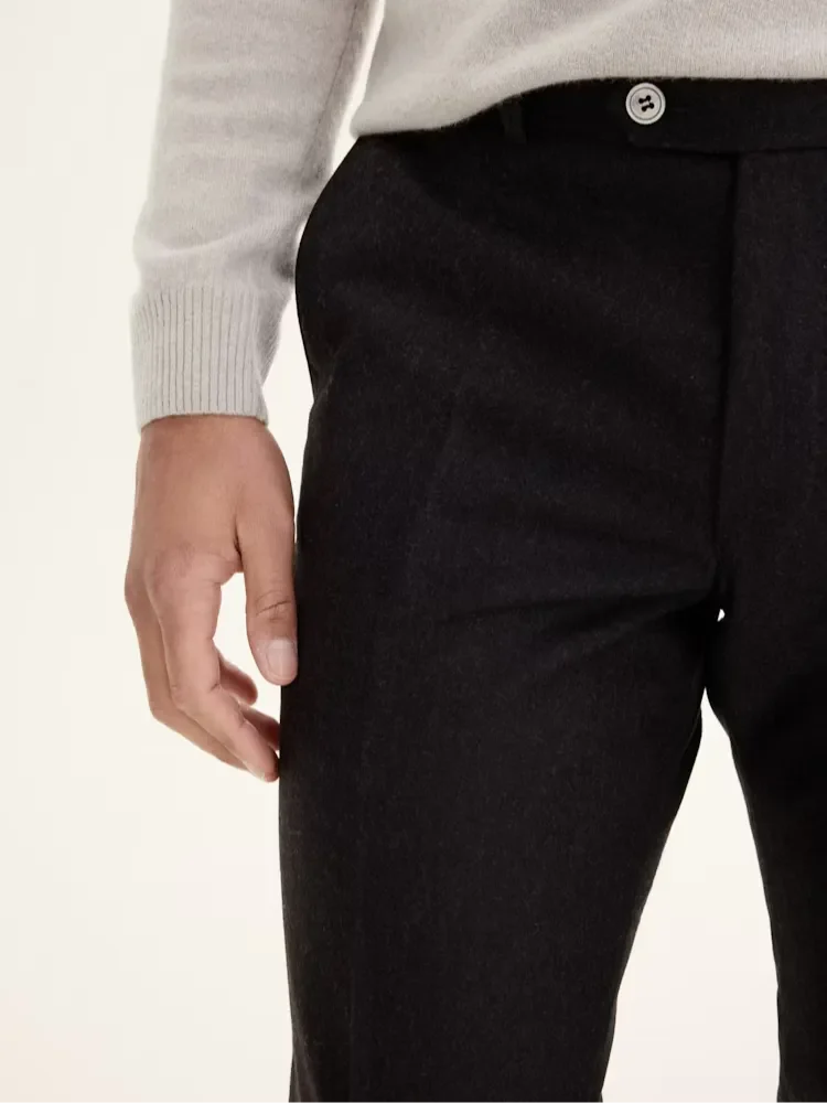 Dressbukse fra Oscar Jacobson. Buksen har to skråstilte frontlommer, beltehemper i linningen og er i 100% ull. Lukkes med glidelås og knapp. Den perfekte buksen å bruke alene til en skjorte, men kombiner den også med Oscar sin Fogerty Blazer for å få en komplett dress. Denne dressen kan du bruke til litt mindre formell og formelle anledninger. Kommer i flere farger.
