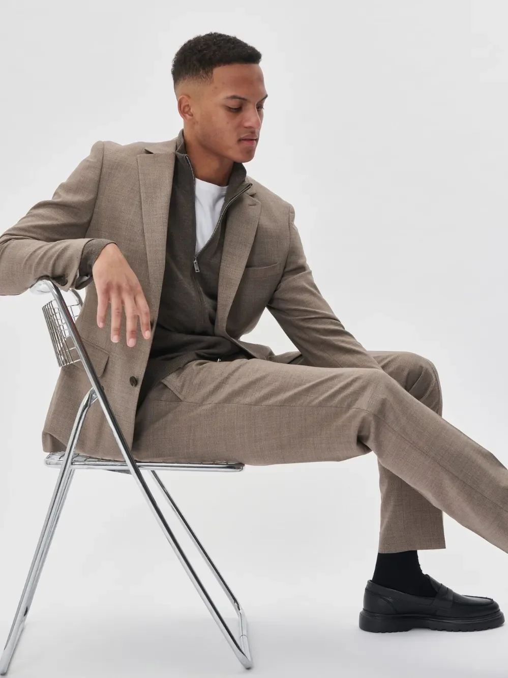 Laget av: 58% polyester, 40% ull, 2% elastan