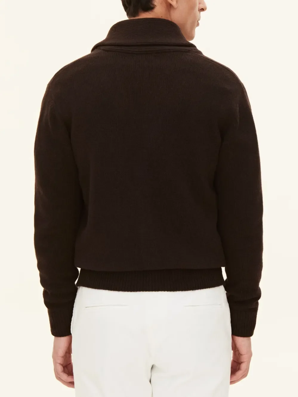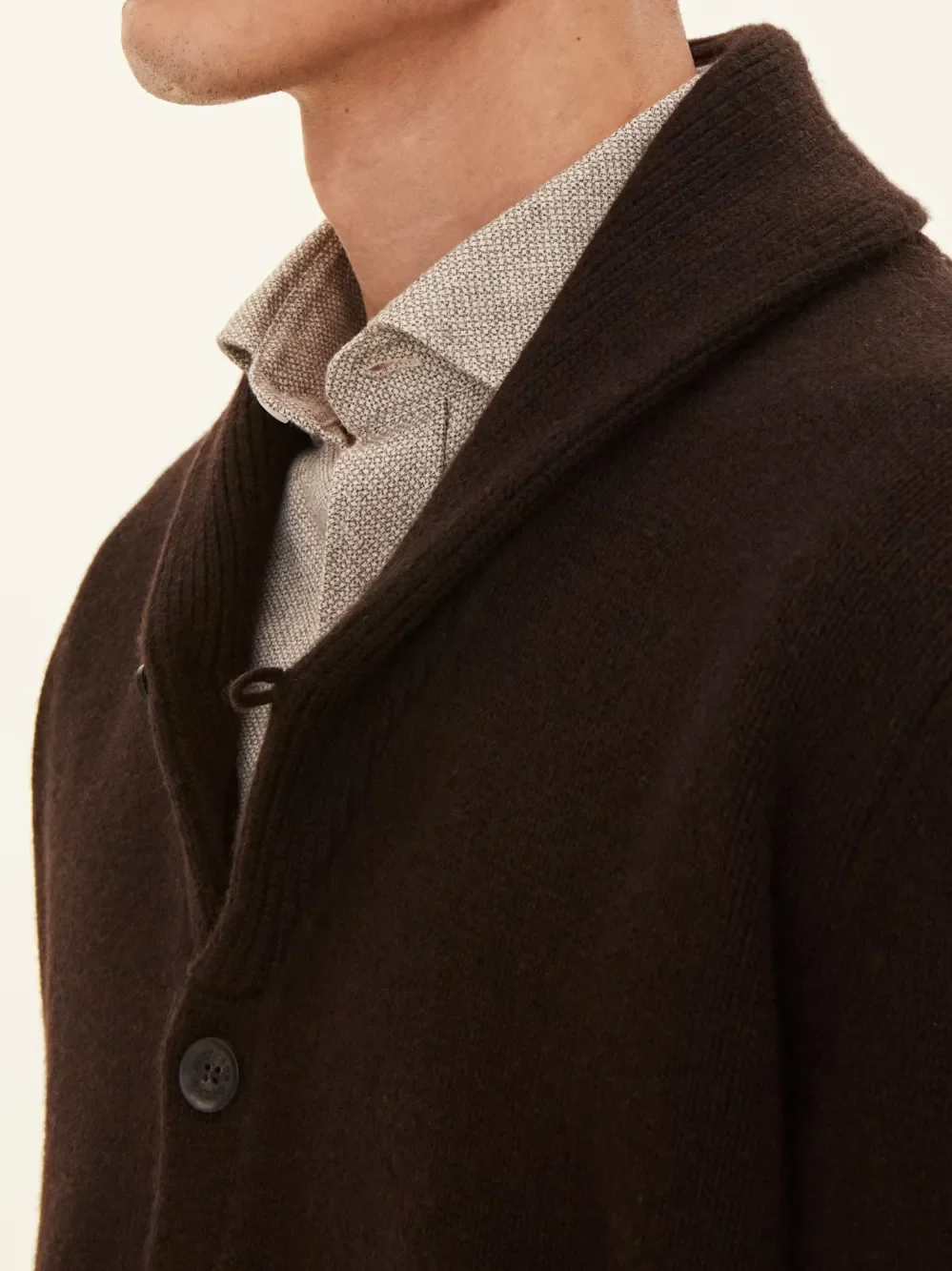 Lekker cardigan fra Oscar Jacobson. Kommer med en tykk krage, v-hals og knapper hele veien ned. Like fin med en t-skjorte inni som med en skjorte.