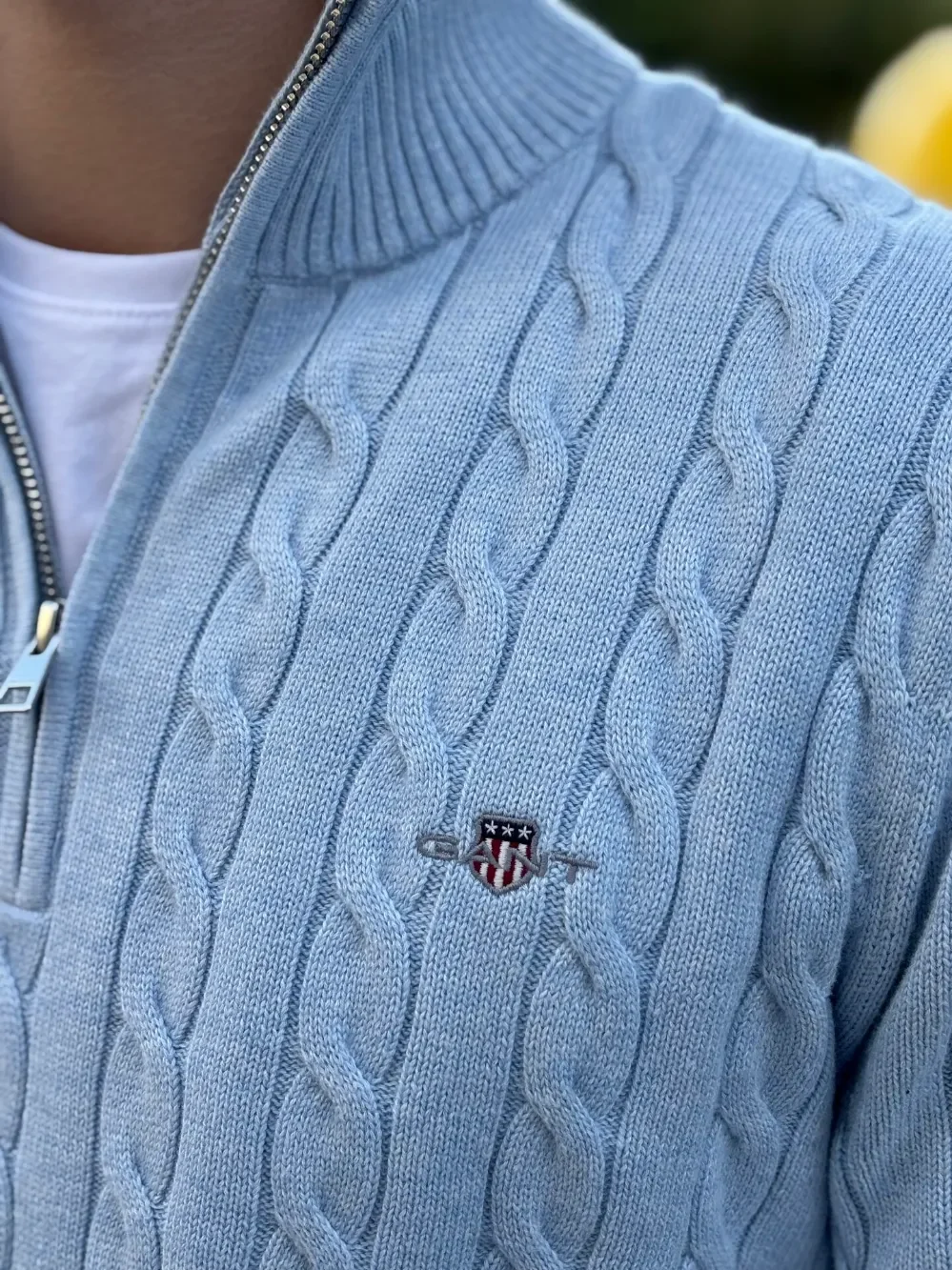 Genser fra Gant. Genseren kommer med en half-zip, ribbestrikk på nederkanten og på mansjettene. Nydelig kabelstrikk med en regular passform som passer både til hverdag og finere anledninger. Like fin alene som med en skjorte inni. Kommer i flere farger.