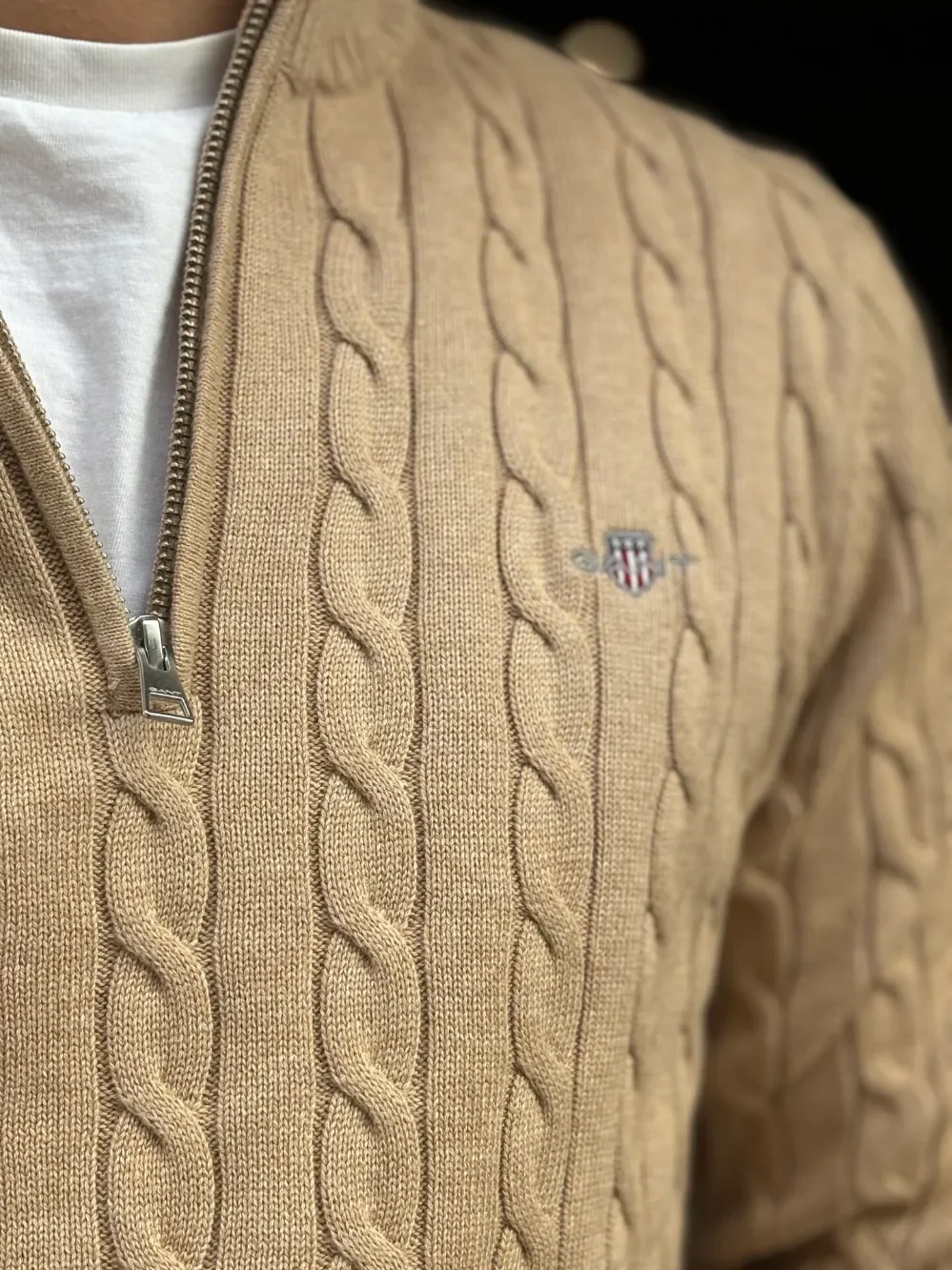Genser fra Gant. Genseren kommer med en half-zip, lekkert kabelstrikk design og den klassiske logoen på brystet. Like fin alene som med en skjorte inni. Kommer i flere farger.