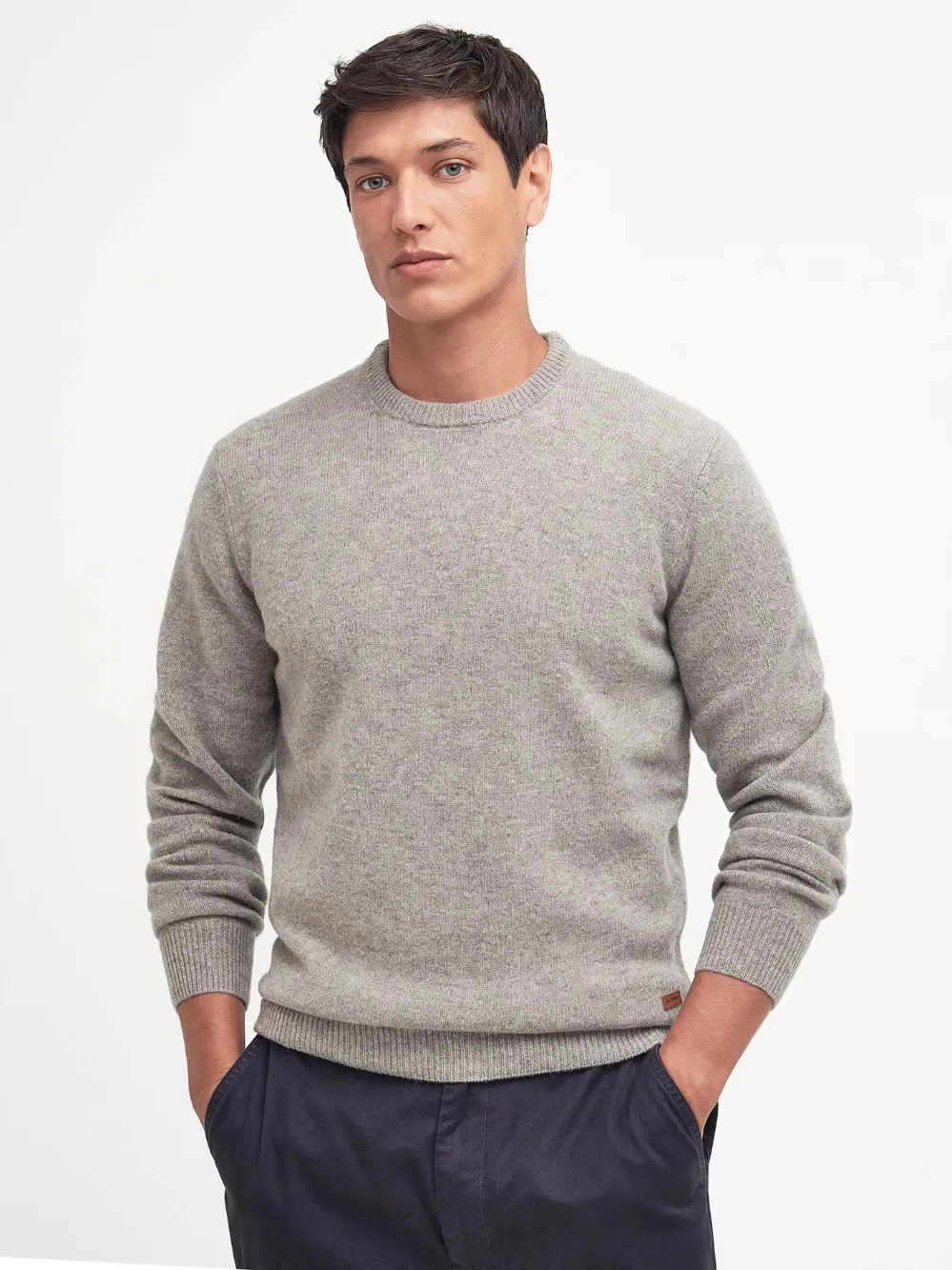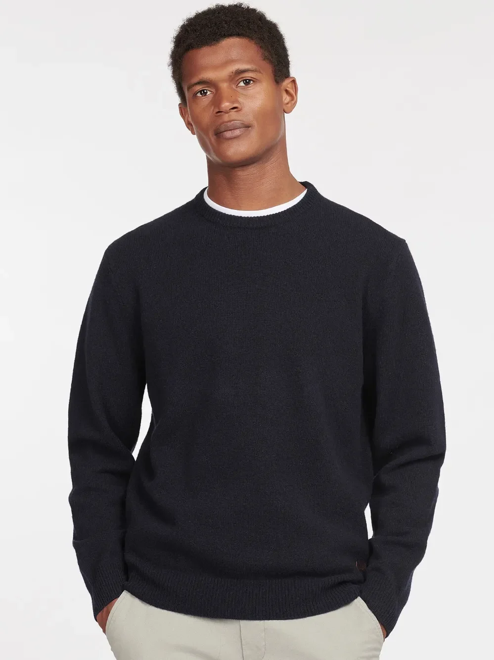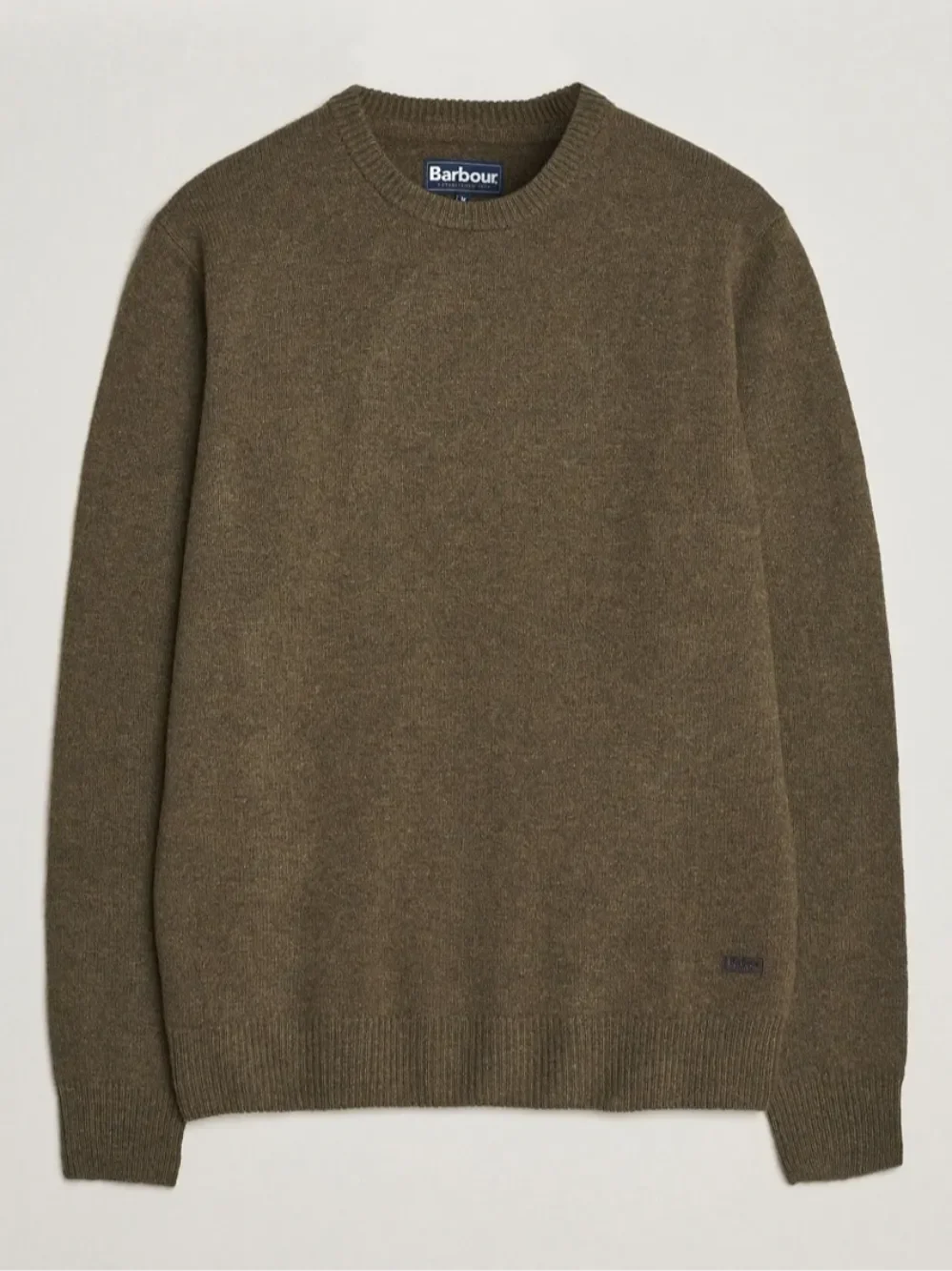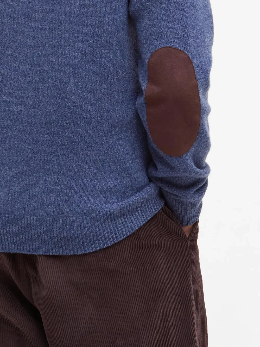 Genser fra Barbour. Denne genseren fra Barbour er laget i 100 % lammeull, som gir en myk og varm kvalitet perfekt for kjølige dager. Kommer med en rund hals og har elegante albuelapper i semsket skinn. Kommer i flere farger.