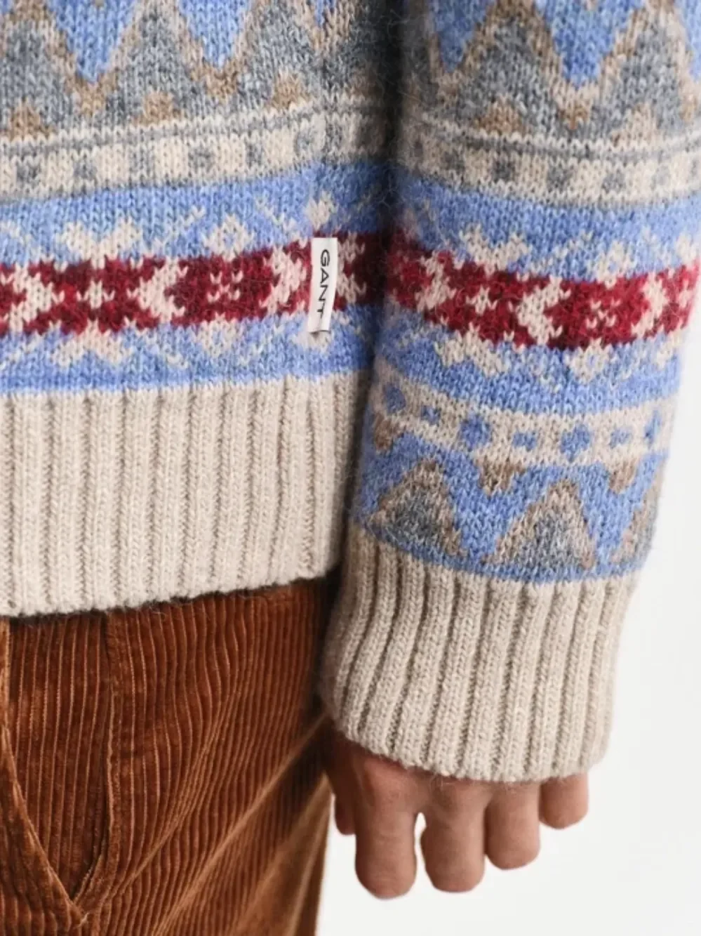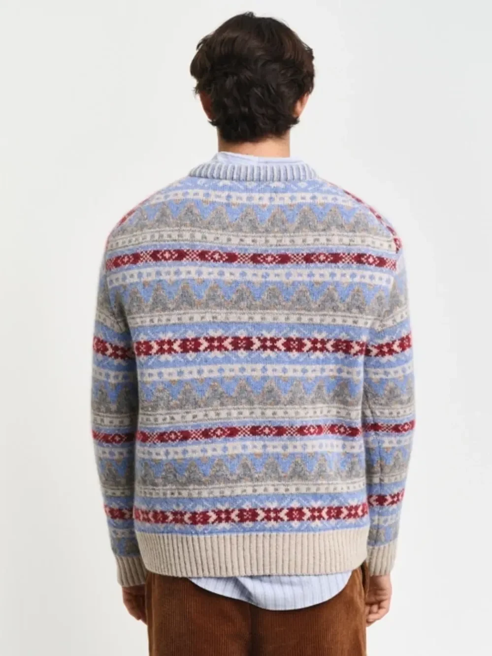 Genser fra Gant. Genseren kommer med en rund hals og et nydelig design.Jacquardstrikket med et tradisjonelt Fair Isle-mønster, denne genseren har en blanding av to italienske garn – nepps og alpakka. Like fin alene som med en skjorte inni. Avslappet passform.