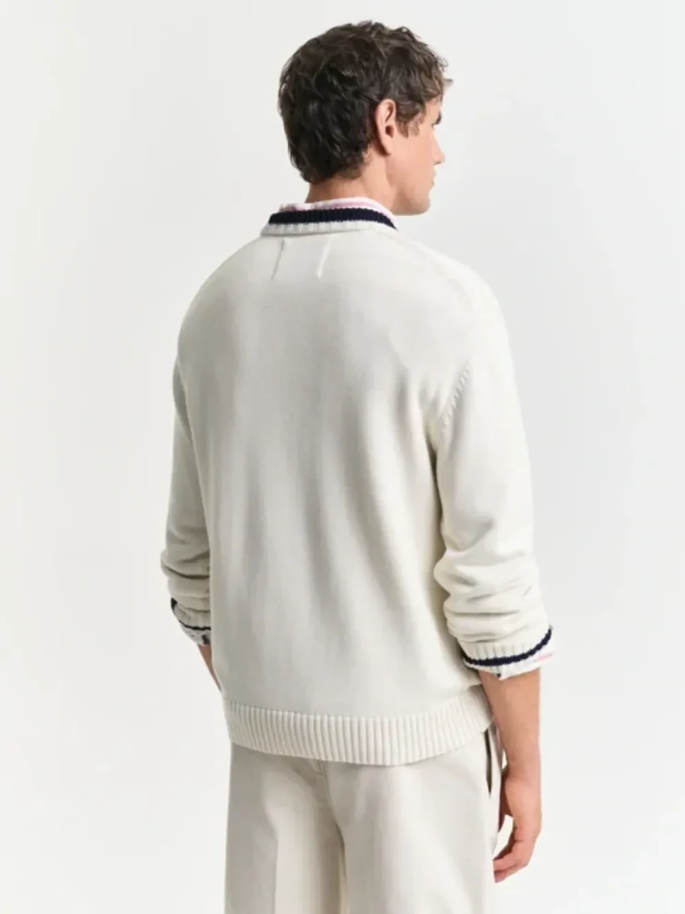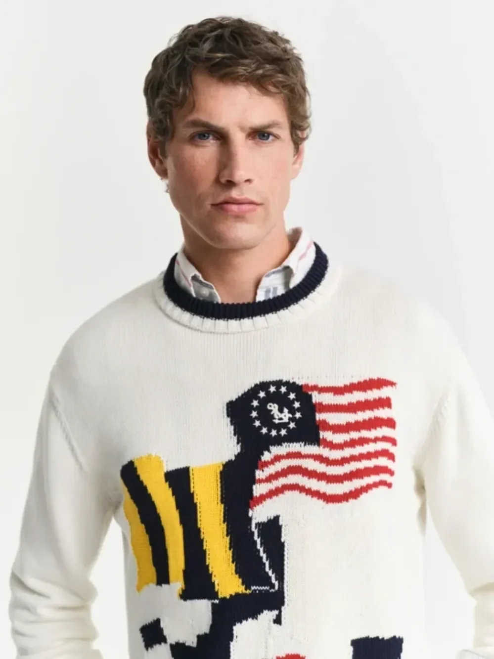 Genser fra Gant. Denne genseren er laget av mellomtykk bomull, har et iøynefallende intarsiamønster med fargerike flagg plassert på kroppen. Super kul bare alene eller med en skjorte inni.