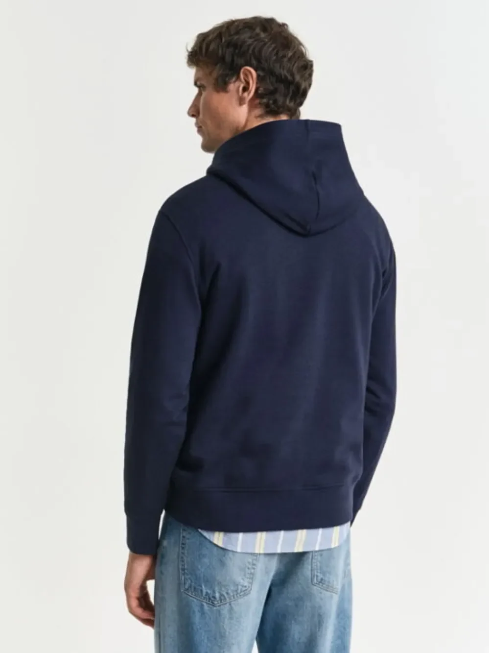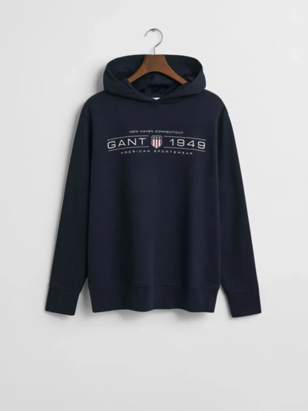 Hettegenser fra Gant. En komfortabel og stilfull genser laget i myk bomull. Den har en stor logo på brystet som gir et sporty preg, sammen med ribbede detaljer og en klassisk hette. Perfekt for en avslappet, moderne look til hverdags. Kommer i flere farger.