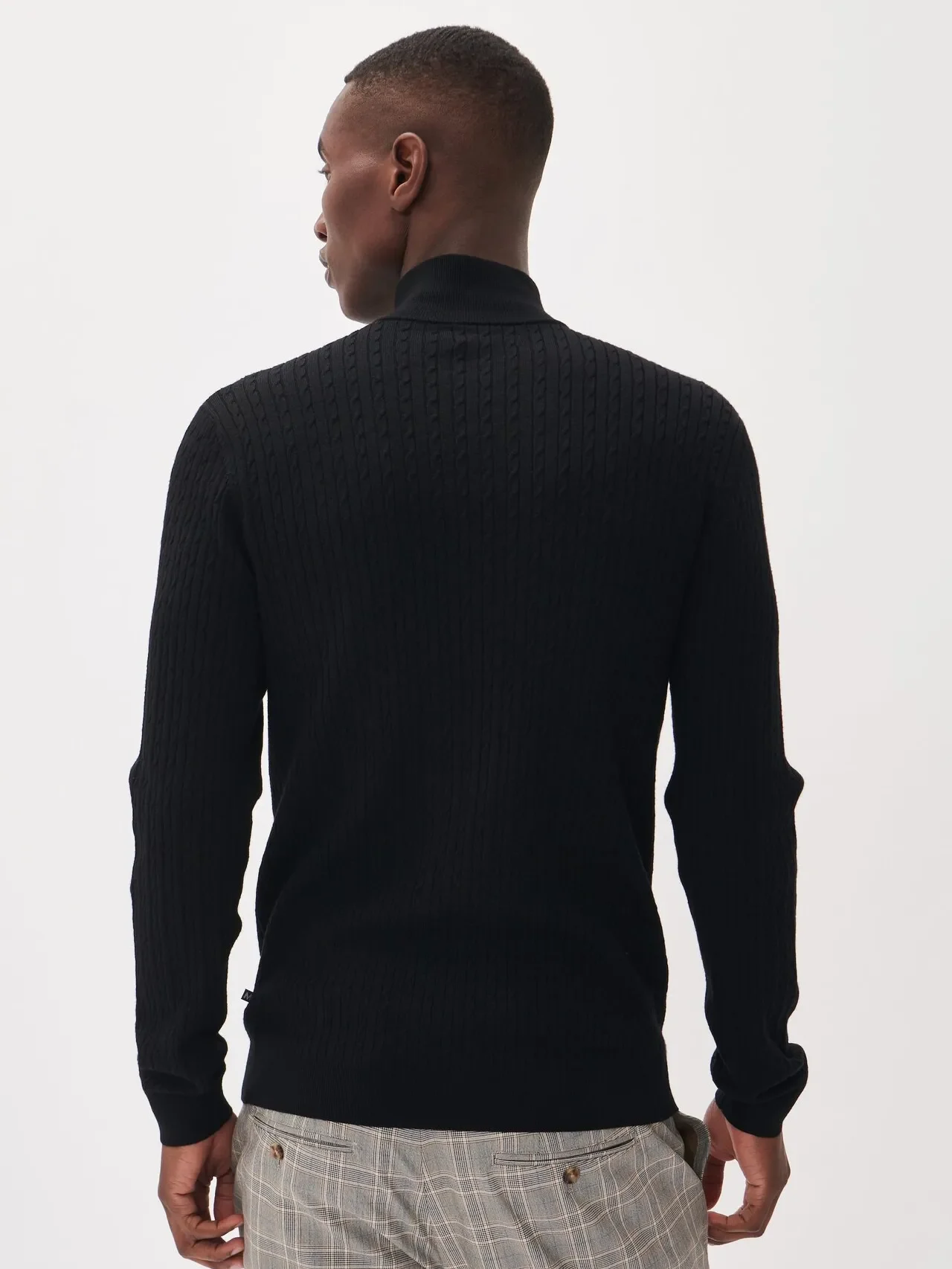 Genser fra Matinique. Genseren kommer med en half-zip, ribbestrikk nederst og på mansjettene. En lekker kabelstrikk som gir den det lille ekstra. Fin inni en blazer, med en skjorte inni eller bare alene.