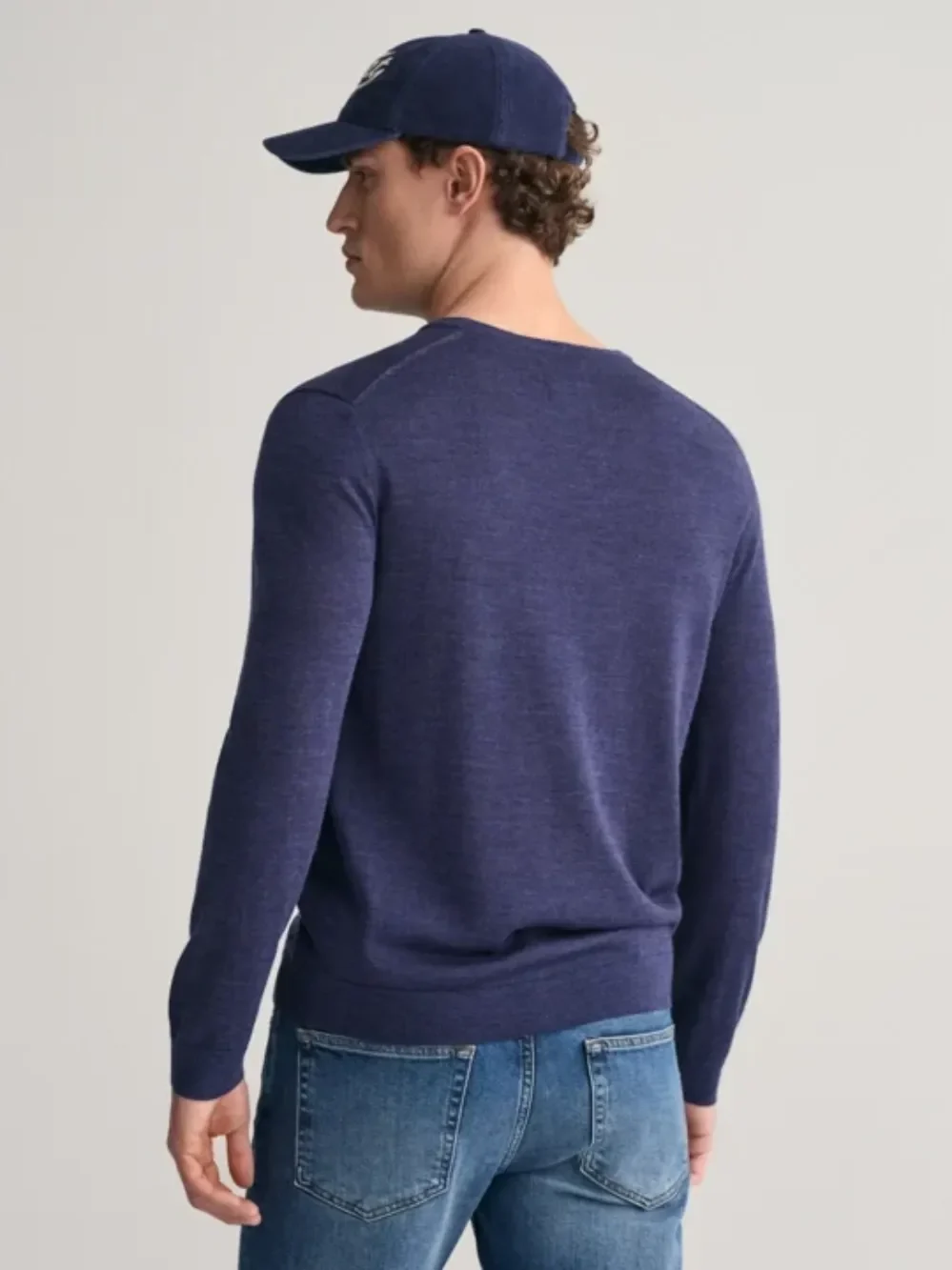 Genser fra Gant. Genseren har en klassisk rund hals, ribbstrikk rundt halsen, på mansjettene og på nederkanten. En diskre Gant-logo på brystet. Like fin med en skjorte inni som den er alene.