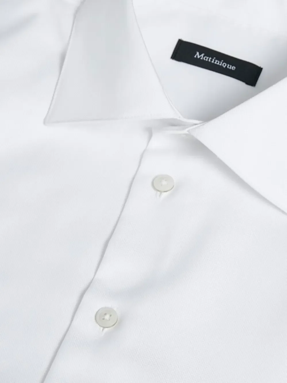 Penskjorte fra Matinique. Skjorten kommer med en klassik krage, hvite knapper hele veien ned i front og litt stuktur, noe som gjør at den ikke er fult så glatt. Fin inni enn dress, under en genser eller bare alene. Tailorfit passform.