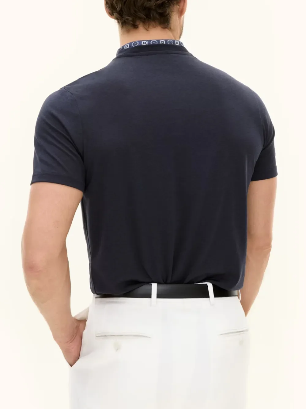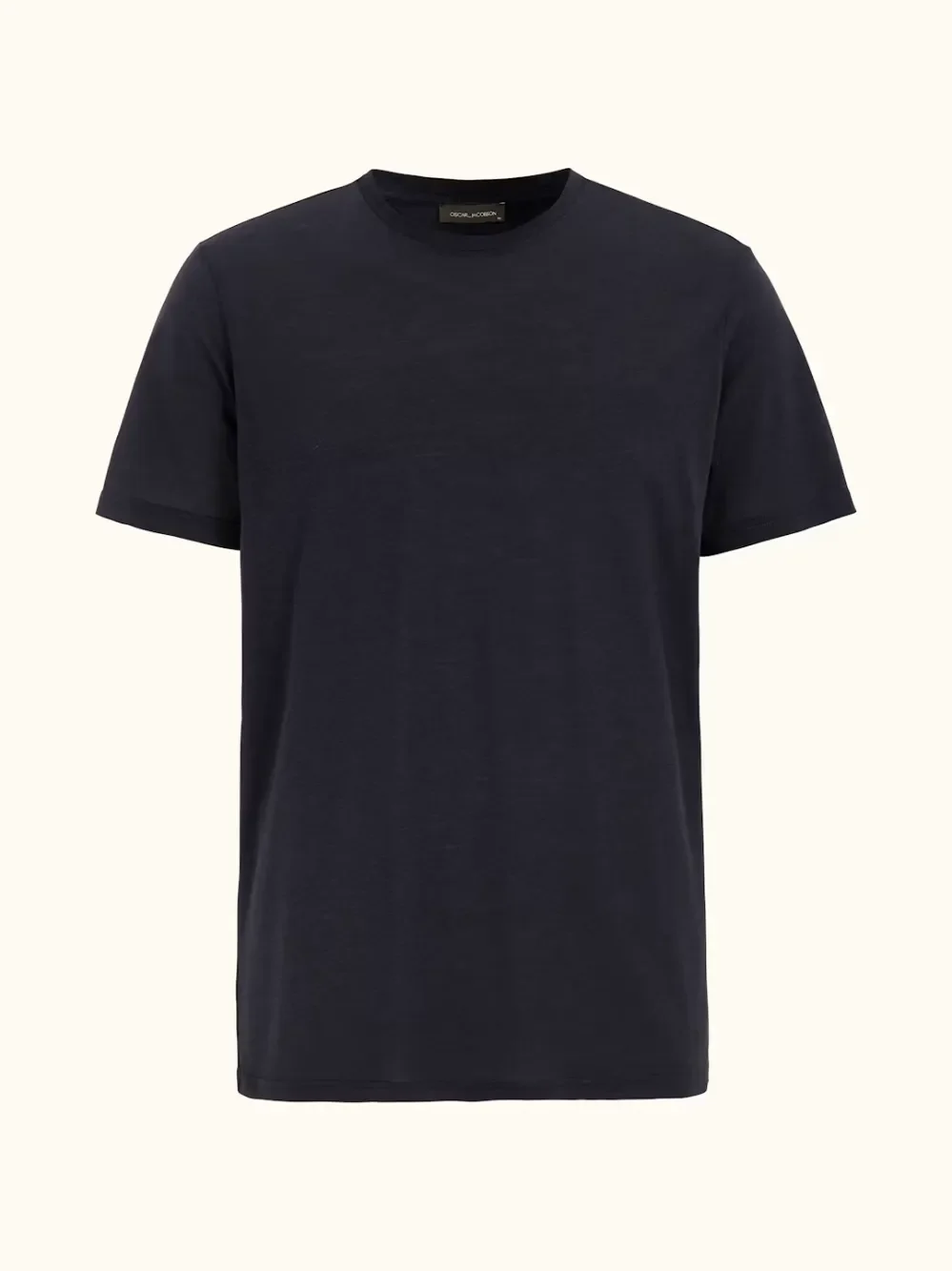 T-skjorte fra Oscar Jacobson. En myk og behagelig t-skjorte laget av bomull og tencel. Stoffet har en subtil glans som gir en stilren og elegant følelse. Perfekt å gå med under blazeren eller i mer avslappede sammenhenger. Kommer i flere farger.